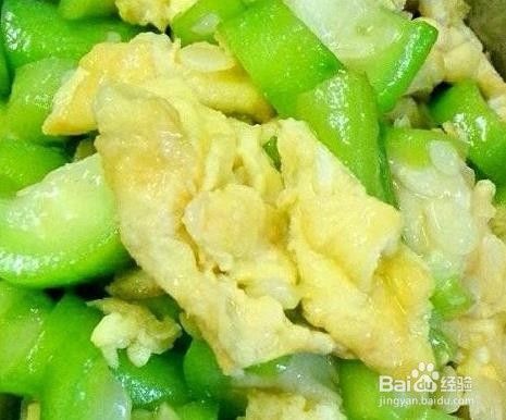 丝瓜炒鸡蛋 丝瓜去皮,洗净,切成大小均匀的菱形状,碗中打入两三个鸡蛋,加少许盐,锅中放油,油热加入鸡蛋液,炒散,盛出备用。锅中放油,不用太多,油热下入丝瓜煸炒两分钟,加入炒好的鸡蛋,加少许盐,味极鲜,耗油,翻炒均匀即可出锅。