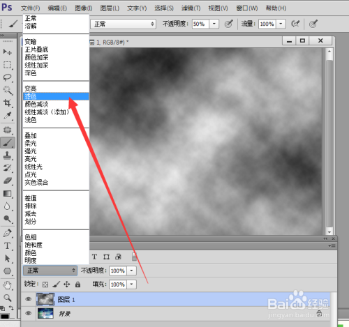 选择上方菜单栏的滤镜-渲染-云彩,然后将图层模式改成滤色