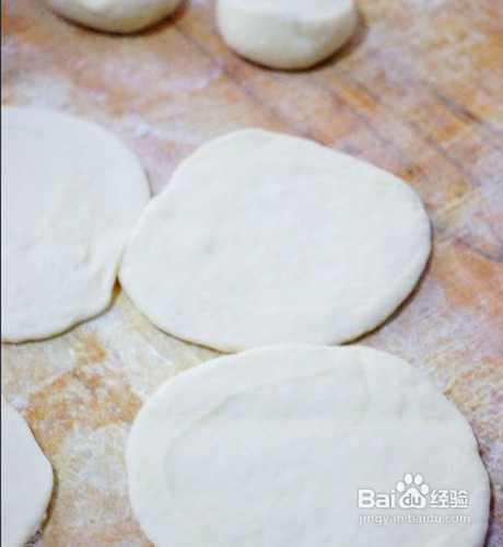 将小剂子按扁用擀面杖擀成圆形薄片;