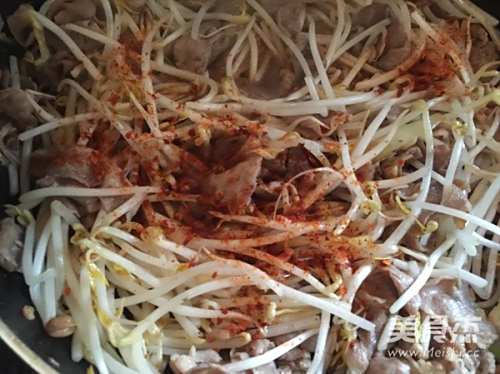 15接着放入豆芽菜。翻炒均匀,然后放入生抽,少许糖。