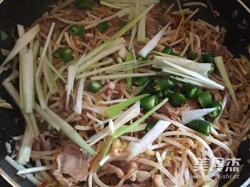 17等豆芽有些软了以后放入剩下的葱,家里正好有杭椒,我就放了两根。更辣一些。