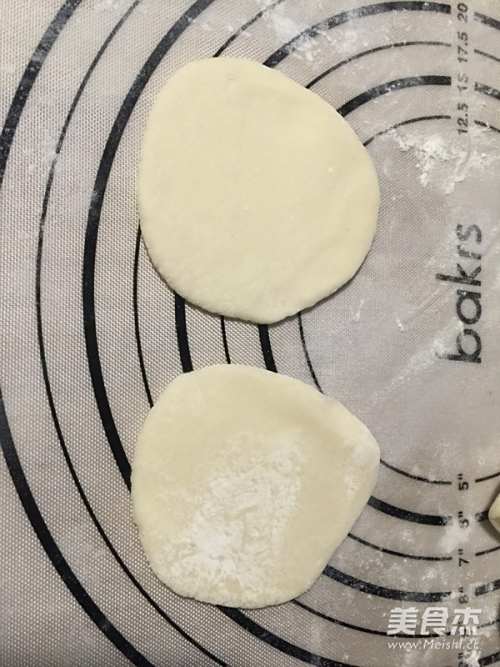 8去两个面剂子,分别压成两个相同的饺子皮大小。