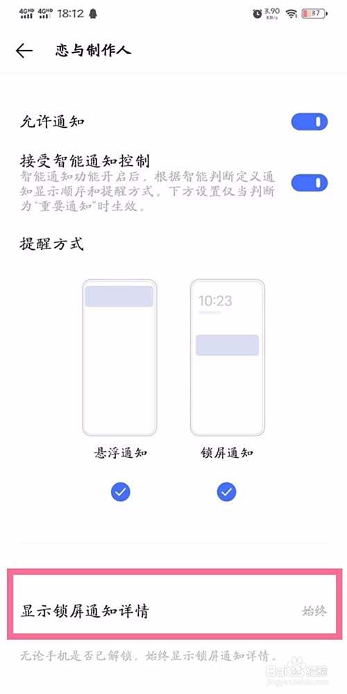 3、选取应用后,关闭【显示锁屏通知详情】。