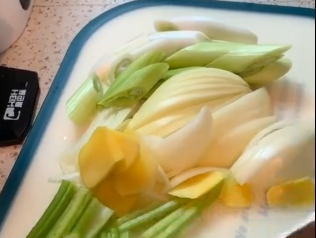 准备大葱、洋葱、姜、切好,大蒜切片,八角、香叶、桂皮、花椒、芹菜切段