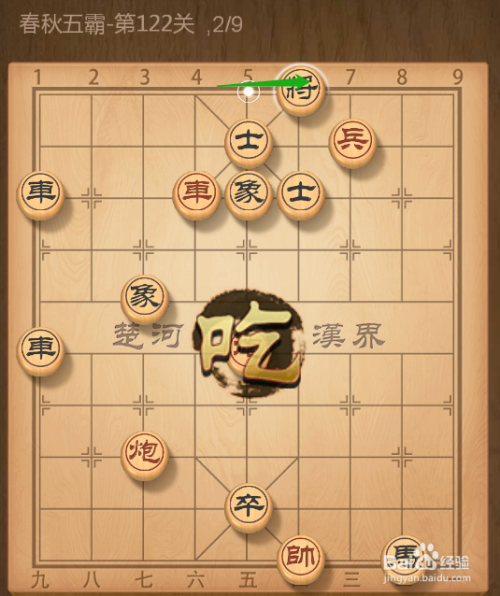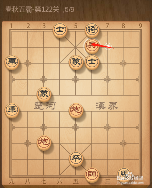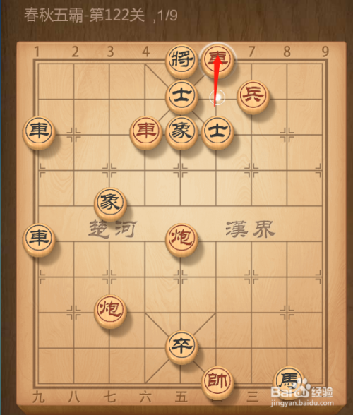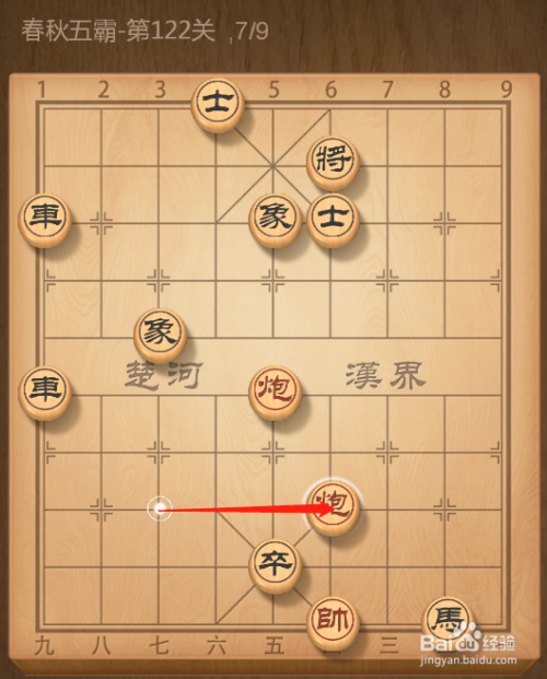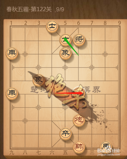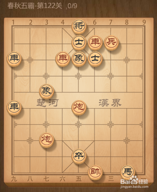 春秋五霸第122关通关共需9步,这一关,黑方只需要一步,红棋就死了,所以通关难度是很大的,小伙伴们可不要大意麻痹,请严格按照我下面图上步骤来走棋,切记盲目乐观,而这一关红方必须将军将军再将军,不能停。请看下图步骤。