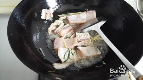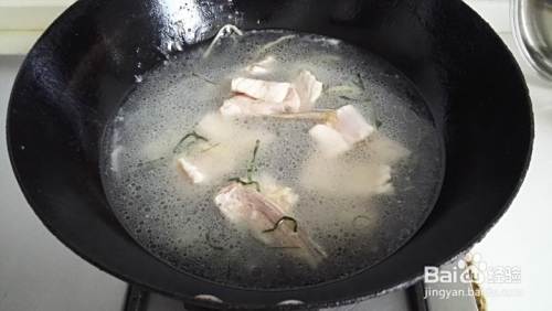 热油锅,放入葱姜炒出香味,放入鱼骨煎