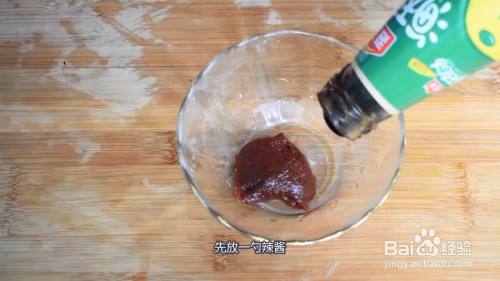 然后把蘑菇里的水分挤出来,准备个小碗调个料汁,先放一勺辣酱,适量蚝油,适量的盐。