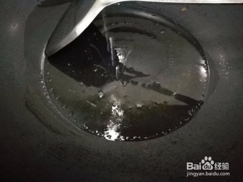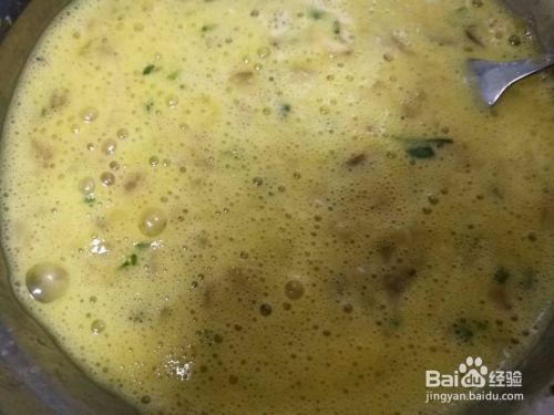 然后用稍微大点的汤勺,边搅拌蛋液并舀一勺放进锅里,这时将火调为小火。