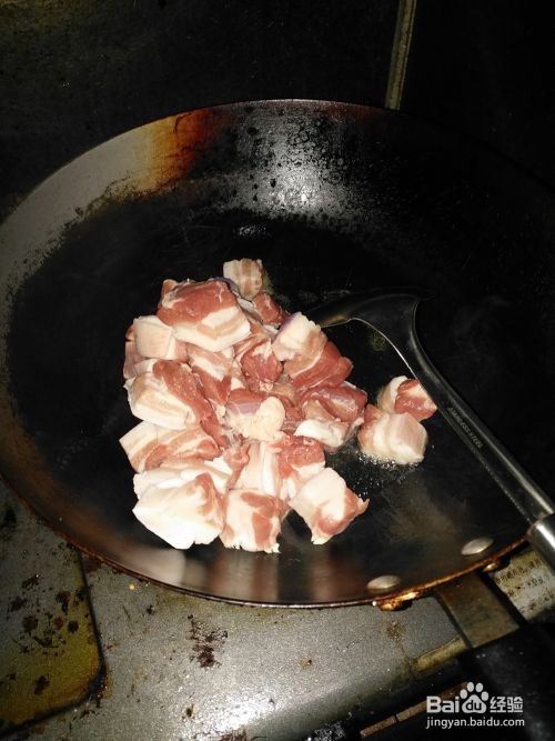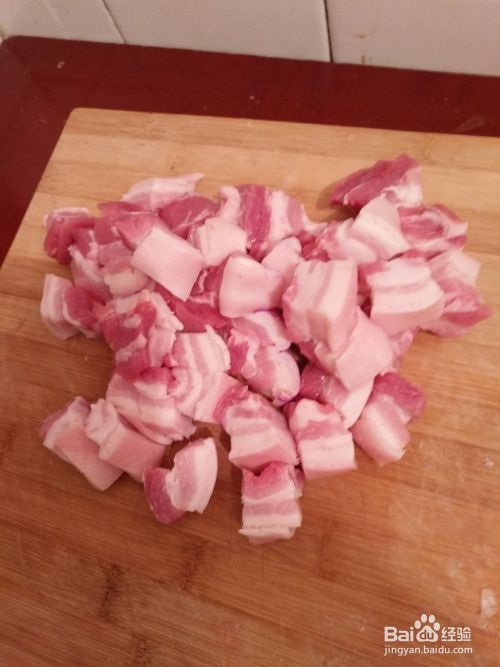 第一步,将五花肉清洗干净,切成小块块放好,注意在切块之前清洗,不要用力洗,不然会有很多的油!