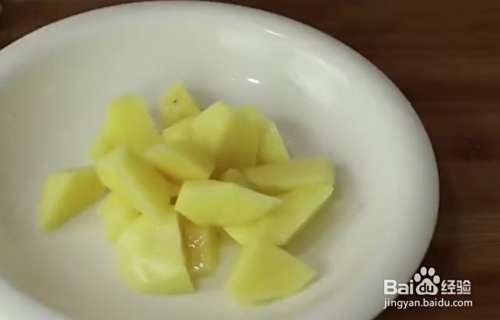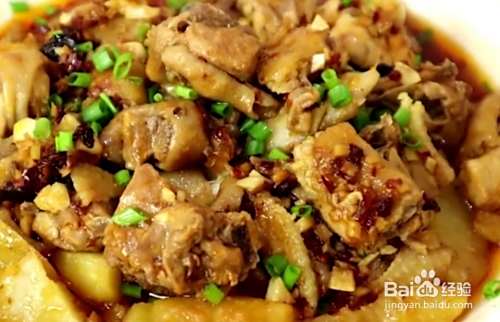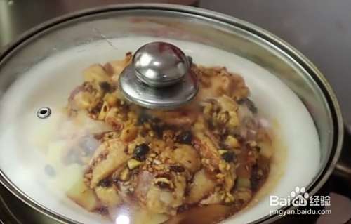 将土豆从中间切开,然后再切成块,放入盘中垫底,然后摆上腌制好的鸡块,倒入料汁。