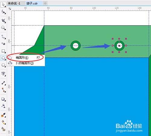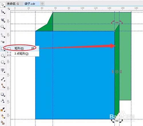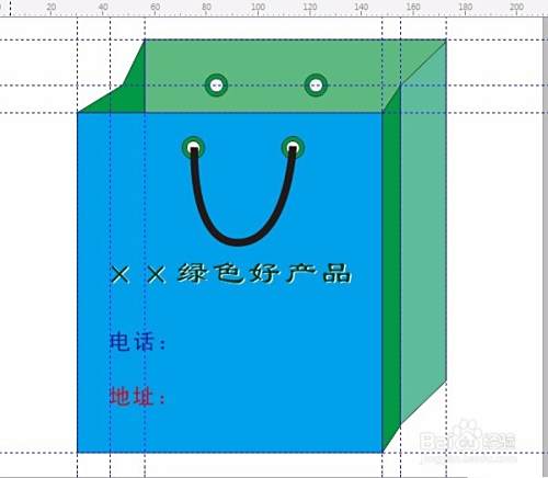 利用辅助线、贝塞尔工具、矩形工具、椭圆形工具、交互式填充工具、调色板、对象菜单、选择工具、属性栏等制作袋子设计类型。