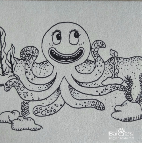 画出章鱼背后的一个不平的小丘陵,用笔点一些圆点来体现沙子的质感。