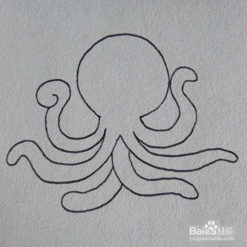 先画出章鱼圆圆的脑袋,并画出章鱼的多条触脚,可以画的对称些,看起来会更美观。