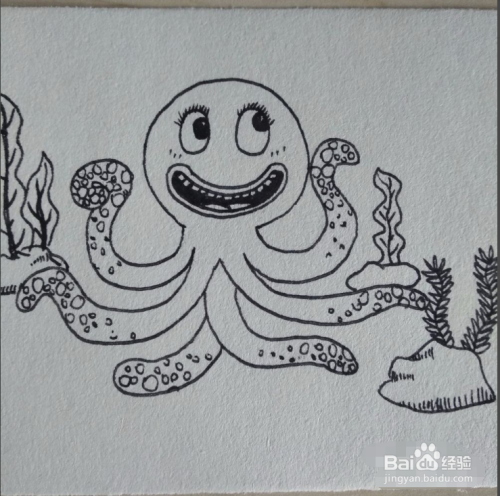 然后画出章鱼的大眼睛以及微笑的嘴巴,可以把牙齿一个个画出来。