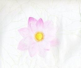 用粉红色的彩色铅笔在一条线上画出花瓣的轮廓。将其绘制在最初的石墨铅笔线上。 在这里你应该决定花瓣的确切最终形状。拿起你的浅绿色的彩色铅笔,并在叶子上做同样的事情。