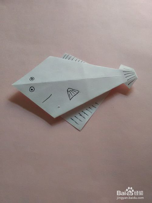 再用笔在鱼的身体下面画一条斜线,表示鱼的嘴,在嘴的右侧画一个小的梯形,在梯形里面画几条短线,表示头部旁边的鱼鳍,一条比目鱼就折好了。