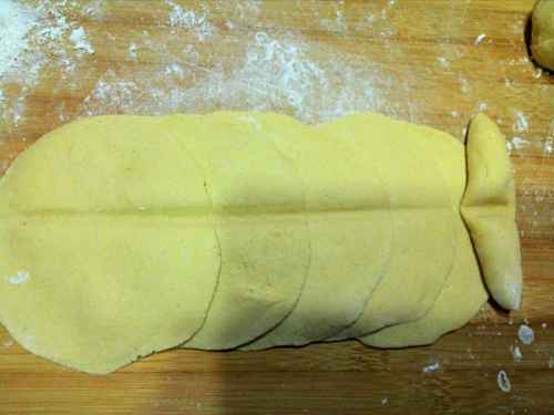 6每组按五等份分成大小均匀的剂子,分别擀成厚薄均匀的面皮。
