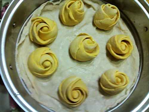 9将做好的玫瑰花生坯醒10分钟后,放入蒸锅中,大火蒸15分钟,在虚蒸三分钟即可出锅。END