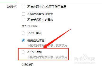 “添加好友验证”模块中找到“不允许添加”选项,如图所示。