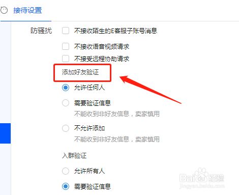 在“防骚扰”页面找到“添加好友验证”模块,如图所示。