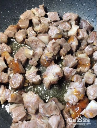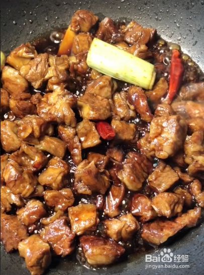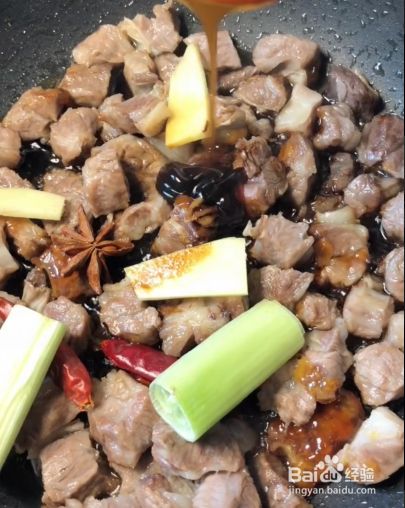 锅中倒油,放入冰糖,炒出糖色,依次放入洗净的牛肉、葱段、姜片、干红辣椒,加入老抽、生抽、蚝油、盐、味精进行调味。