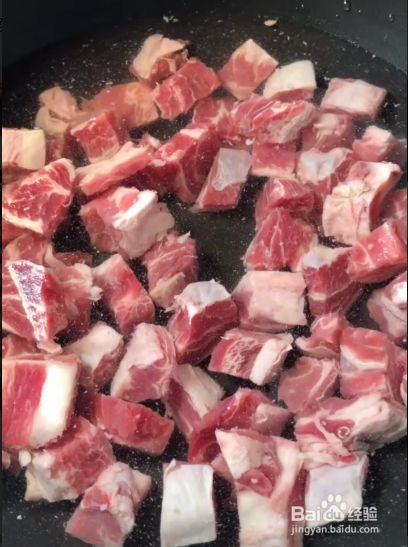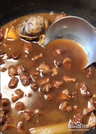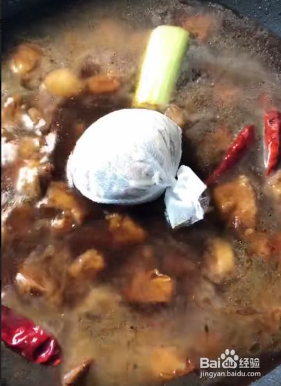 f翻炒均匀,锅中加入热水,水要没过牛肉,放入大料包(桂皮、花椒、香叶、肉桂、八角)。