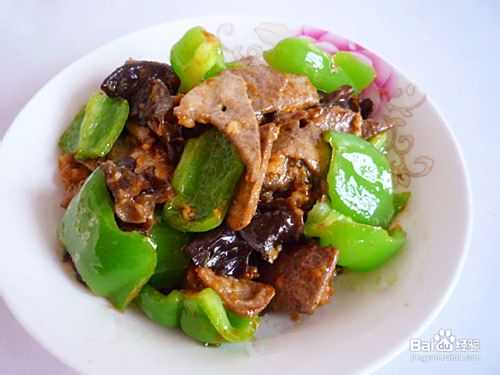9烹入醋,依次放入炸好的猪肝,木耳、青椒,翻炒几下,再倒入调好的碗汁大火翻炒。
