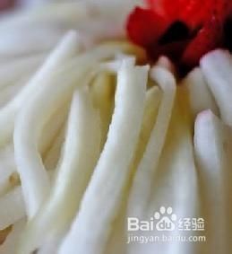 1,将萝卜切成小条,不要太细,然后用盐腌上半个小时以上。腌好的萝卜用水洗一遍后把水挤干净。 2,在腌萝卜的时候,将白醋,糖和适量的白开水调匀,让糖充分溶化做成泡萝卜的盐卤水。白醋的用量不能少,我切了一个大白萝卜,用了半瓶白醋。糖的用量也挺大的,多少可以根据自己的口味调控。水其实用的比较少,是为了稀释一下白醋刺激的味道,如果不觉得白醋味道很刺激,可以不用。水要等糖完全溶化后,少量多次添加。 3,将挤干水的萝卜条放入盐卤水中,浸泡一个晚上就可以食用了。