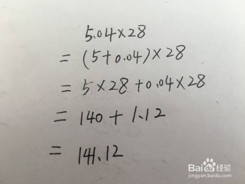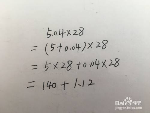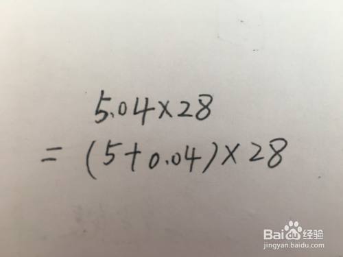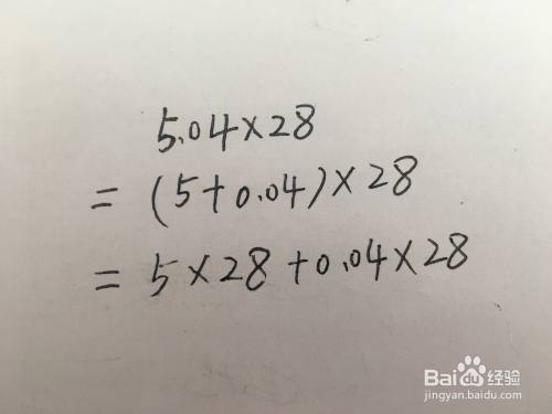 利用乘法分配律,将28分别和5、0.04相乘,如下图所示: