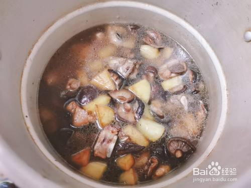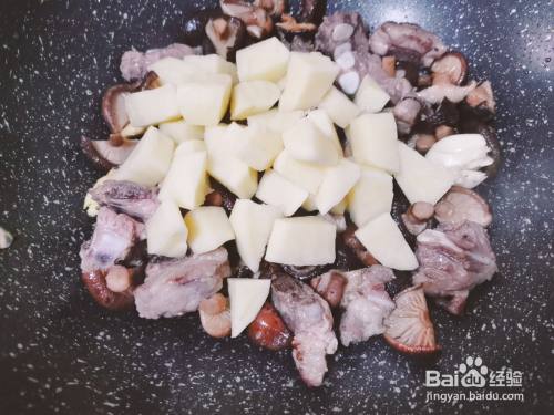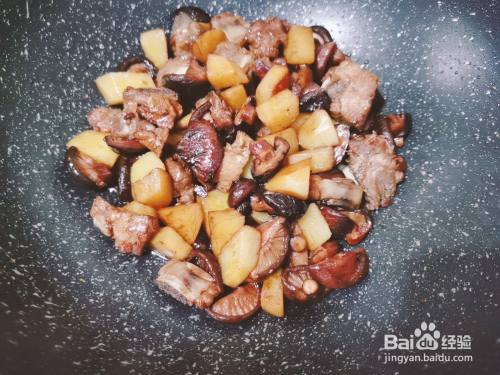 接下来把香菇和土豆倒进锅翻炒均匀,再加盐,收抽,老抽,再次翻炒均匀。