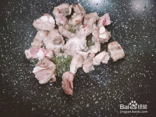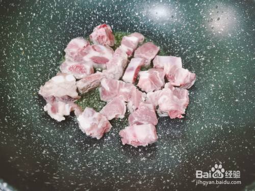 起锅热油,先把排骨炒二分钟,炒出排骨的香味。