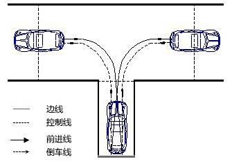 考试过程中,车辆进退途中不得停车。从道路一端控制线(车身压控制线)倒入车库停车,再前进出库向另一端驶过控制线后倒入车库停车,最后前进驶出车库。
