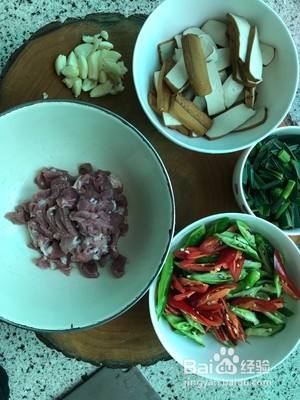 猪肉切薄片,香干切片,青红辣椒切滚刀块