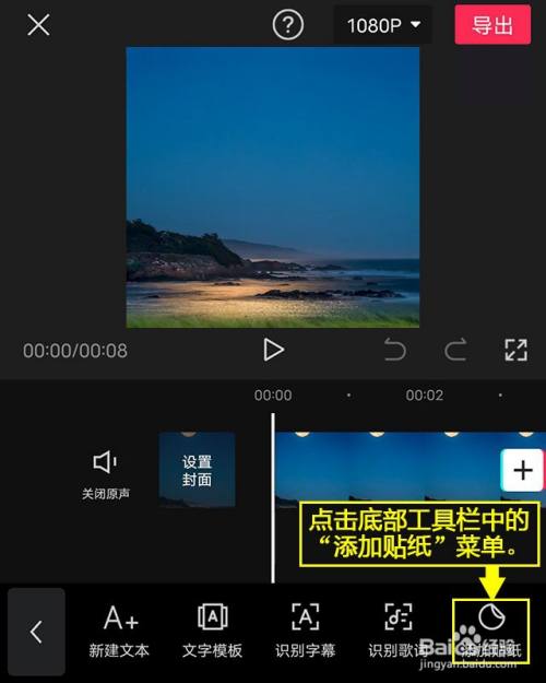 点击添加贴纸。点击底部工具栏中的“添加贴纸”菜单。