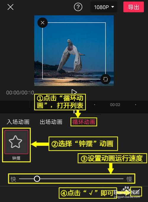 添加动画。点击“循环动画”,打开列表,选择“钟摆”动画,设置动画运行速度,点击“√”即可。