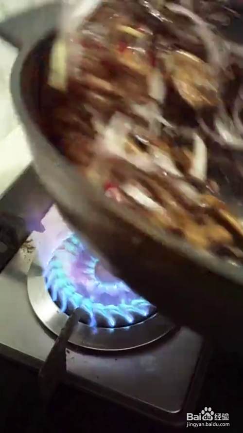放入干辣椒丝,姜丝,圆葱丝干炒出香味来,加入盐半勺孜然粉炒均,撒芝麻香菜出锅即可