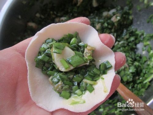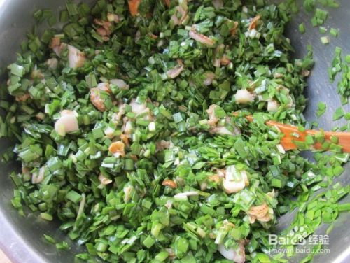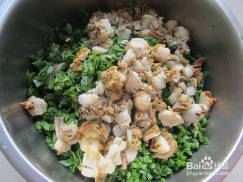 把韭菜摘洗干净,用淡盐水浸泡10分钟,再冲洗干净,切碎成馅,把扇贝肉洗净剁碎一起放入盆里