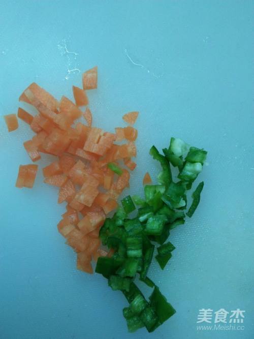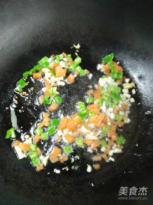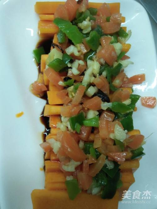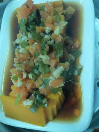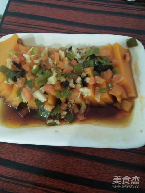 把炒好的蔬菜丁倒在南瓜上面,放几粒豆豉,生抽,就可以上锅蒸煮。