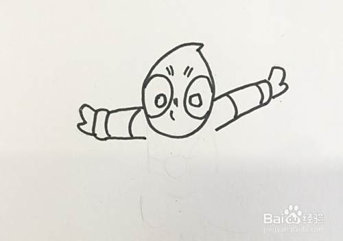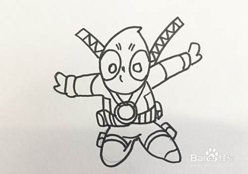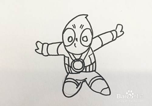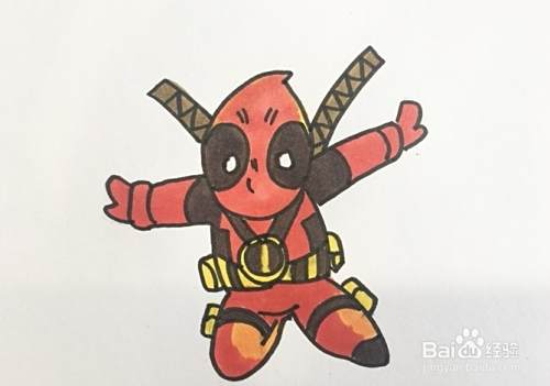 先画出椭圆形的头部轮廓,画上两只大眼睛后,向下画出张开的双手,继续向下画出死侍的身体,胸前戴着牌子,画出一些细节部分,最后给死侍身体涂上红色和深棕色,腰上和腿上的东西涂成黄色,死侍简笔画就画好了。