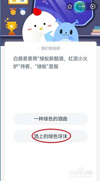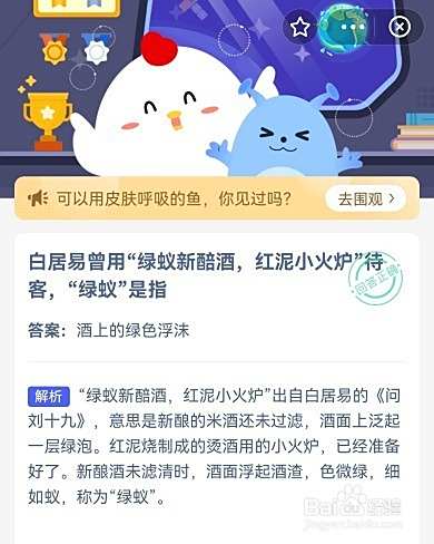 题目是:白居易曾用“绿蚁新酷酒,红泥小火炉”待客,“绿蚁”是指什么?