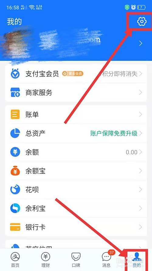 进入支付宝页面后先点击我的,然后再点击右上角的设置图标