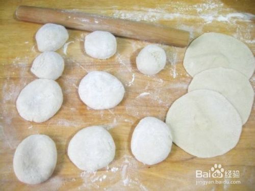 将面团放在案板上,撒些干面粉,搓成长圆条,揪20个面剂,按扁,擀成小圆饼。
