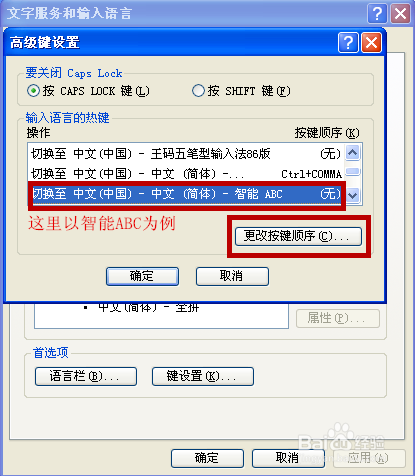 在这里小编就以智能ABC为例,当然你也可以选择自己喜欢的输入法,选择好输入法后单击【更改按键顺序C】如图所示。