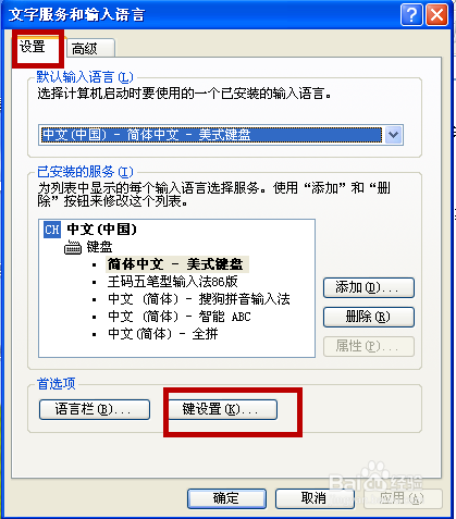 在【文字服务和输入语言】对话框里单击【设置】,然后再单击【键设置】如图所示。