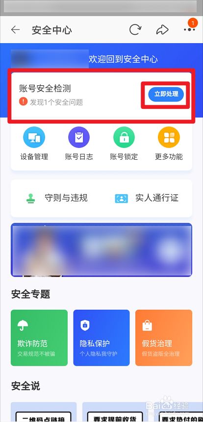如下截图所示,淘宝存在账号安全风险,选择“立即处理”。