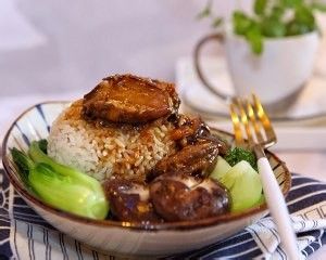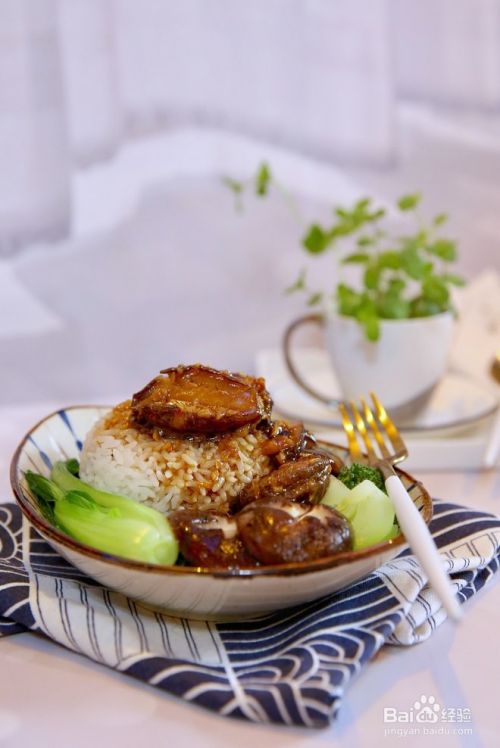 蒸好的米饭装小碗里,稍稍压实,然后扣到盘子里,放入油菜、西蓝花、香菇和鲍鱼,淋上汤汁