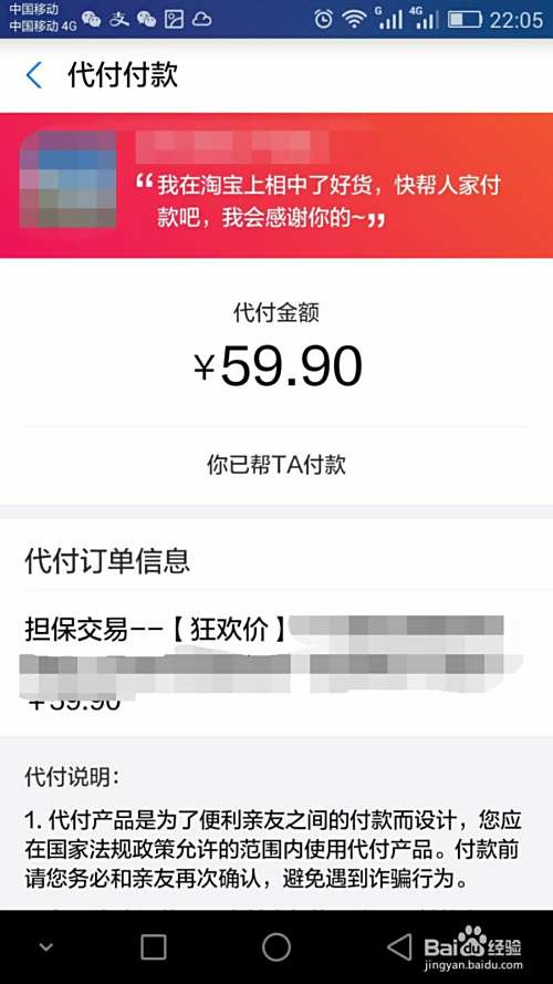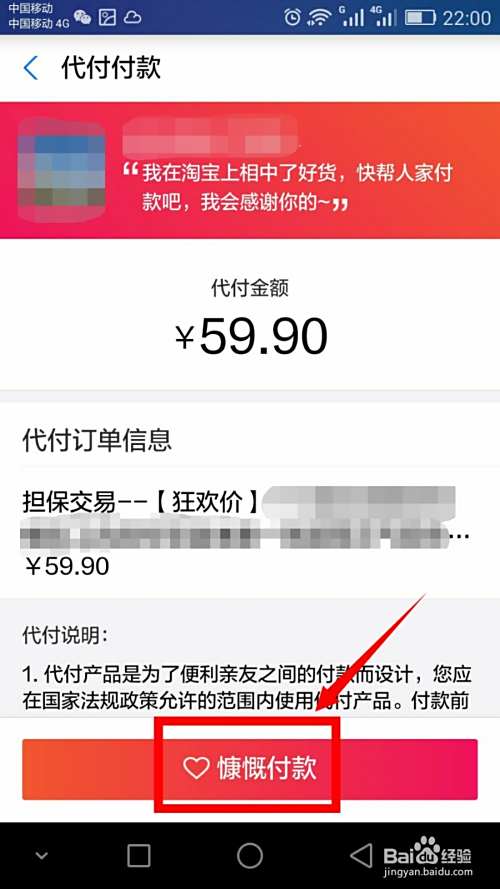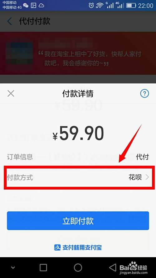 让朋友打开自己的支付宝帮忙代付,在支付宝【朋友】里面找到你的支付宝昵称,进入对话款后点击你发给他的代付商品链接,打开后,点击【慷慨付款】