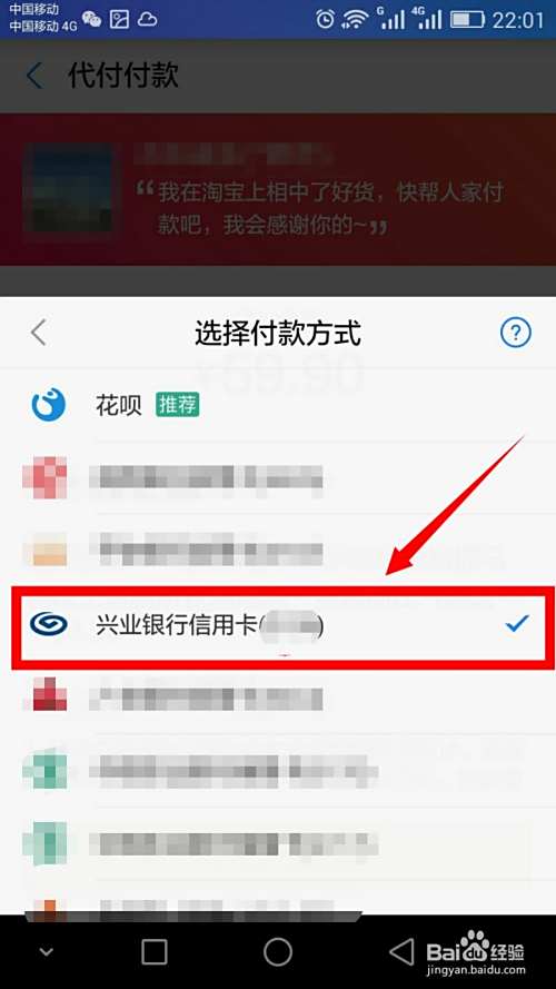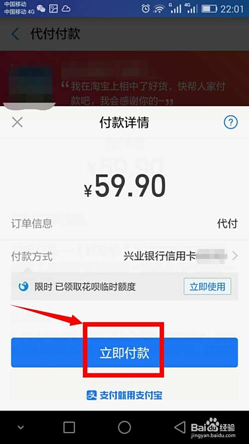 付款方式,选择【兴业银行】,点【立即付款】。输入密码,代付成功,(注:选择银行卡付款之前,要先支付宝绑定银行卡,才能选择)