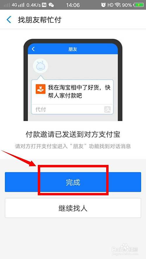 选择【找朋友帮忙付】,找到支付宝好友(注:需要先把朋友添加为支付宝好友,朋友的支付宝账号才会出现,选择会比较方便,如果是首次找朋友代付, 可以填写朋友的手机号(或支付宝账号),发送给他,就可以了)。点击【确定】,点击【完成】