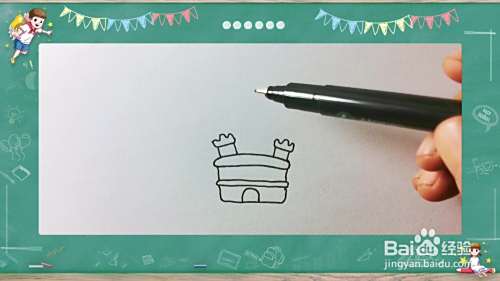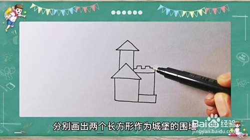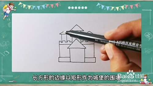 首先画一个三角,下方画两条垂直的直线,三角的上方再画一个相对较小一点的三角和两条垂直的直线,然后三角儿的左右两边分别画出两个长方形作为城堡的围墙。
